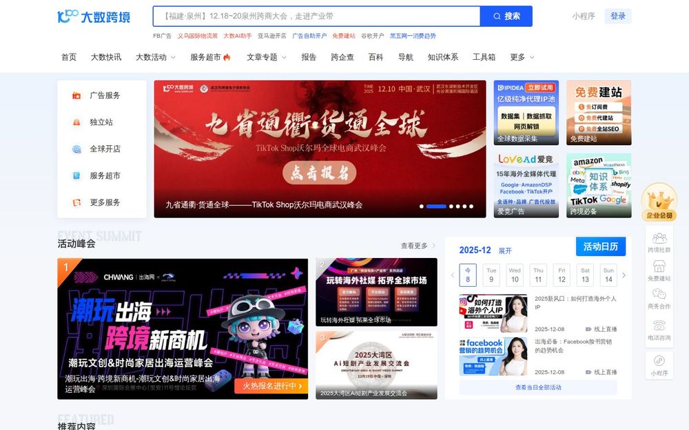 大数跨境(10100)是一个面向跨境电商与出海企业的开放型服务与内容平台,致力于整合跨境运营所需的工具、服务商与行业洞察。平台覆盖广告投放、独立站搭建、全球开店、物流仓储、支付结算、税务合规与申诉等全链路能力,同时提供海量报告、知识体系与线上线下活动,帮助品牌快速进入海外市场并持续优化运营效果。