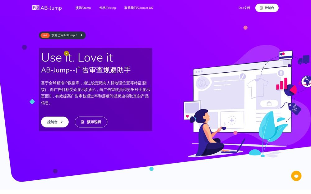 AB跳转(ABJump)是一款专注于广告审查规避与精准流量分流的工具,帮助广告主在广告审核和投放过程中,针对不同访问者展示差异化页面,从而保护核心产品信息并提升广告投放的通过率和转化率。系统基于全球IP数据库和多维指纹判断,支持快速创建跳转项目和无代码接入,适配多种主流广告平台的第三方链接投放场景。