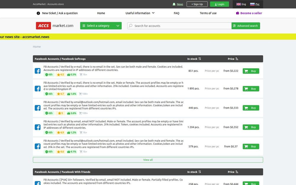 AccsMarket 是一个面向专业用户与营销方的在线账号与社交媒体服务市场,网站集中展示并销售大量经过不同验证和配置的社交媒体账号,以及针对账号权重和可用性的增粉、点赞、评论、播放量等提升服务。页面按平台和用途(例如 Facebook/Instagram/TikTok/Telegram/Gmail/Steam/游戏账号 等)细分品类,明确列出账号的验证方式(邮箱、短信、2FA)、是否包含 cookies/token/useragent、注册地区 IP、是否可用于广告投放或已激活 Business Manager,以及库存、最低价格和用户评分等信息。