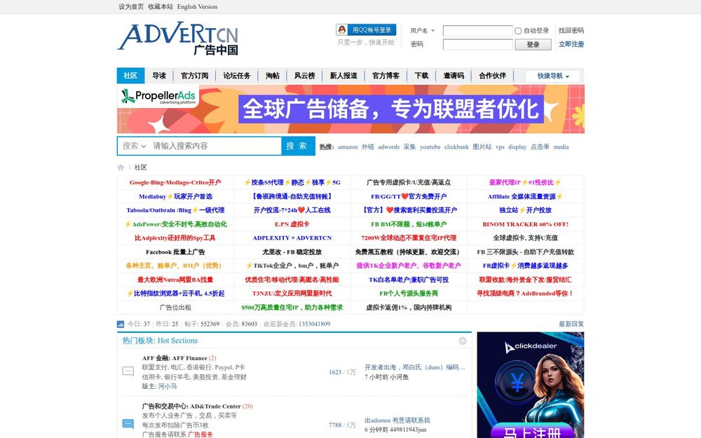 网站展示多家合作伙伴(如PropellerAds、Binom、百度MediaGo等)以及大量合作链接,便于用户获取官方代理与优惠信息。站内同时活跃着付费服务、开户代投、素材预审与技术支持的帖子,构成了以信息流通与商业对接为核心的生态链。