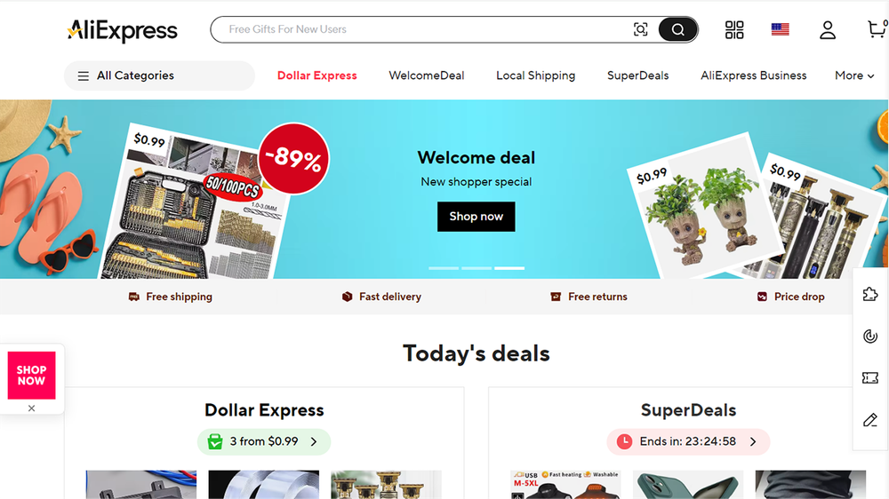 - 速卖通币(Coins)返利,可抵现;VIP会员专享免运费、优先退货等权益