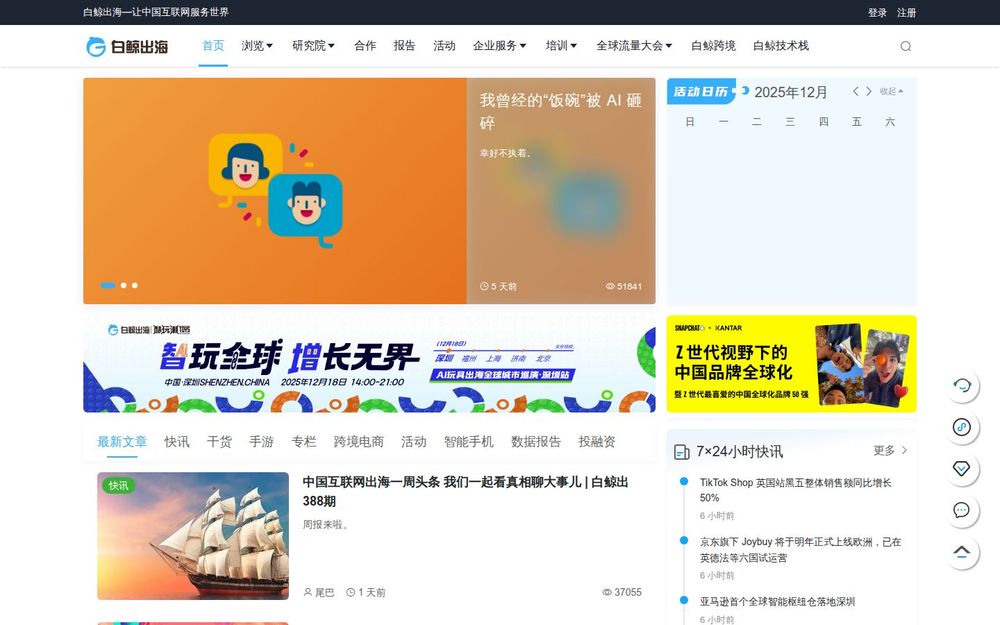 白鲸出海(Baijing)是一个专注于中国泛互联网企业“出海”的综合服务平台,成立于2014年,长期覆盖全球市场动态、产品与企业数据、行业报告与榜单、以及面向企业的对接与咨询服务。平台通过内容、数据、服务与社群四大模块,为出海企业、开发者和服务商提供信息、资源与商业变现的连接通道。其内容包括快讯、深度文章、专题专辑与行业报告;服务覆盖推广、支付、法律合规、投融资与招聘等环节;并常年组织全球流量大会、路演与行业沙龙等活动。