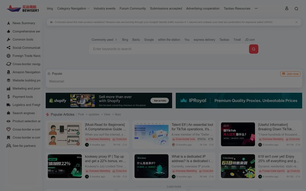 见远领航(Bewiser)是为外贸出口与跨境电商从业者打造的一站式导航与资源聚合平台。它通过清晰的分类和大量外部工具、平台与服务链接,帮助用户在选品、运营、推广、支付、物流和合规等环节快速获取所需资源,提升国际化业务效率。
