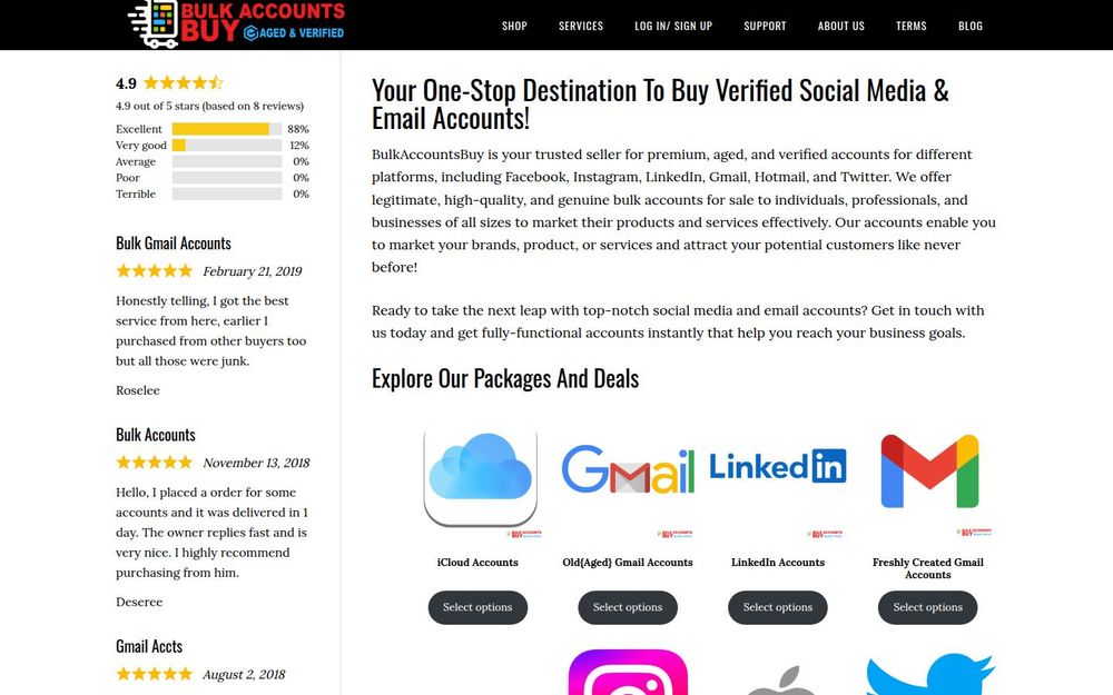 BulkAccountsBuy 是一家提供批量社交媒体与电子邮件账号的在线商店,主打经电话验证(PVA)账号、老旧/熟龄账号及新建账号,覆盖 Facebook、Instagram、LinkedIn、Gmail、Hotmail、Twitter、TikTok、YouTube 等多种平台。平台面向个人、自由职业者、数字营销团队与各类企业客户,声称所有账号均经过测试、验证并使用不同手机号与独立 IP 注册,旨在为客户提供可即时使用、稳定可靠的账号资源,帮助实现品牌推广和用户触达目标。