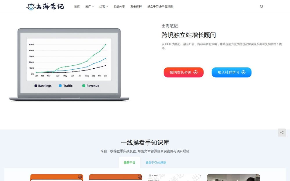 出海笔记是面向跨境独立站与出海品牌的增长咨询与内容平台,定位为“跨境独立站增长顾问+知识共同体”。站点以真实操盘案例为内容来源,既输出深度战略洞见,也提供可落地的执行方法。核心服务包括长期 SEO 构建、广告投放策略、网站与内容系统搭建、转化率优化和增长陪跑咨询,旨在帮助品牌实现可持续且可复制的海外增长。