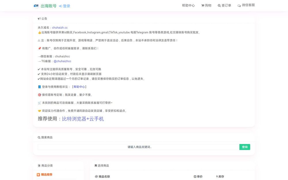 chuhaizh 是面向出海需求的账号交易与批发平台,致力于为跨境电商、海外推广与海外游戏运营提供稳定、可批量交付的社媒与邮箱类账号。平台通过网站展示多类商品分类与样例,包括 Facebook、Instagram、TikTok、YouTube、Telegram、Gmail、Apple ID、Outlook 等,支持自动发货与人工客服对接,适合需要大量账号资源的团队与代理商。