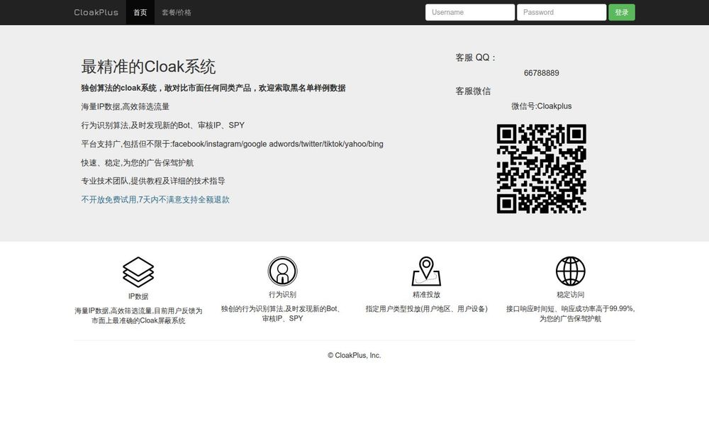 CloakPlus 是面向广告投放与流量保护的一款专业 Cloak 屏蔽系统,旨在通过海量 IP 数据与独创行为识别算法,实时识别并拦截 Bot、审核 IP、SPY 等风险流量,从源头保障广告策略与转化效果。该平台支持多种主流投放渠道,提供稳定、低延迟的接口服务,并由专业技术团队提供部署与运维指导。产品定位为付费商业服务,不提供免费试用,但支持 7 天不满意全额退款,适合对投放质量与合规性有严格要求的广告主和代理商。