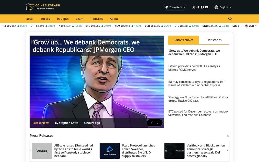 Cointelegraph 是一家面向全球的加密货币与区块链新闻媒体与行情平台,长期提供关于 比特币(Bitcoin)、以太坊(Ethereum) 及其他主流数字资产的新闻报道与价格指数。网站集合编辑报道、市场分析、专题深度和行业公告,为交易者、投资者、研究者与产业观察者提供实时信息与背景解读。