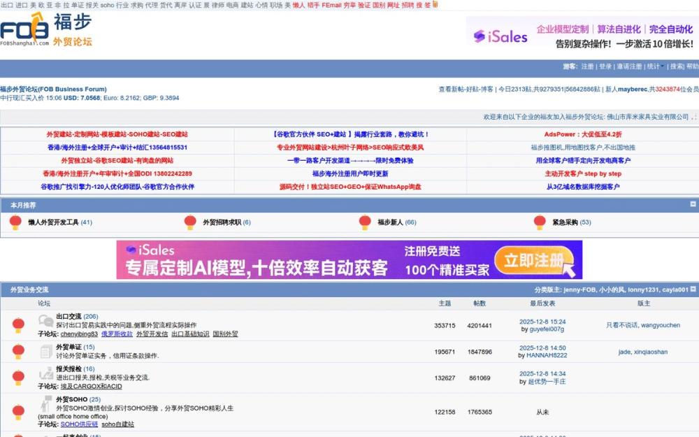 福步外贸论坛(FOB Shanghai)是面向外贸从业者的综合性社区平台,长期聚焦外贸实务、国际市场、物流与供应链等话题。平台以论坛形式组织内容,汇集大量行业经验帖、实操指南和工具类资源,适合跨境贸易的日常沟通、问题求助和信息共享。