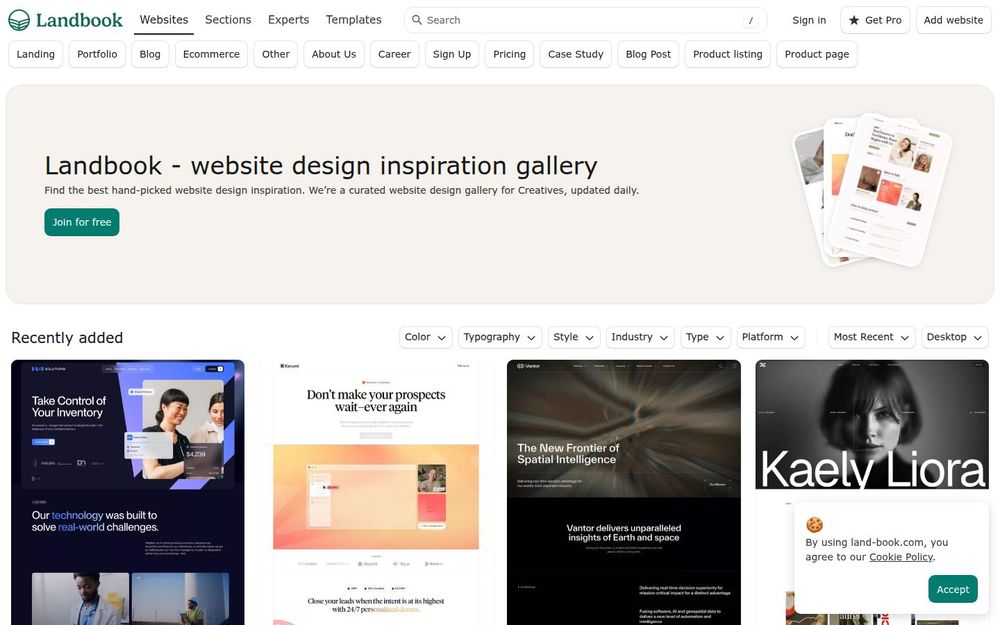 Landbook 是一款专注于网站设计灵感的在线图库与资源平台,面向设计师、产品经理、前端工程师和创意团队。平台以人工精选的方式收录优秀网站样例,按风格、配色、排版、行业与平台等维度分类,并每日更新,帮助用户在短时间内获取高质量的视觉与交互参考。Landbook 同时支持免费与付费会员,满足不同使用强度的需求。