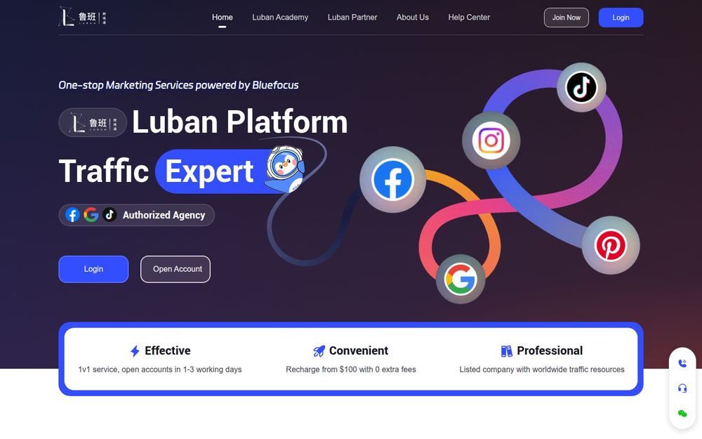 鲁班是BlueVision(蓝色焦点旗下子公司)推出的海外营销一体化平台,定位为为跨境电商与品牌广告主提供从开户、充值到投放、优化和风控的全流程解决方案。平台整合多家全球媒体渠道与流量资源,辅以AI工具和专业团队支持,旨在提升广告投放效率与转化表现,帮助客户实现稳定增长与市场扩张。
