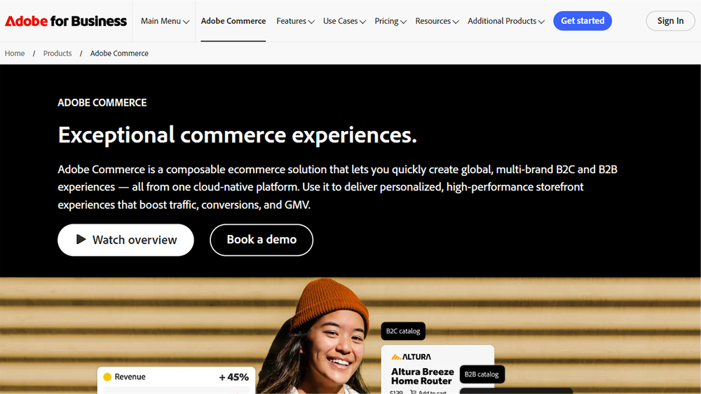 - 原生集成 A/B 测试、站内搜索(Adobe Sensei 驱动)、直播购物、订阅制、礼品卡、弃单挽回、Loyalty 积分体系,以及与 Google、Meta、TikTok 等广告平台的深度转化 API 对接。