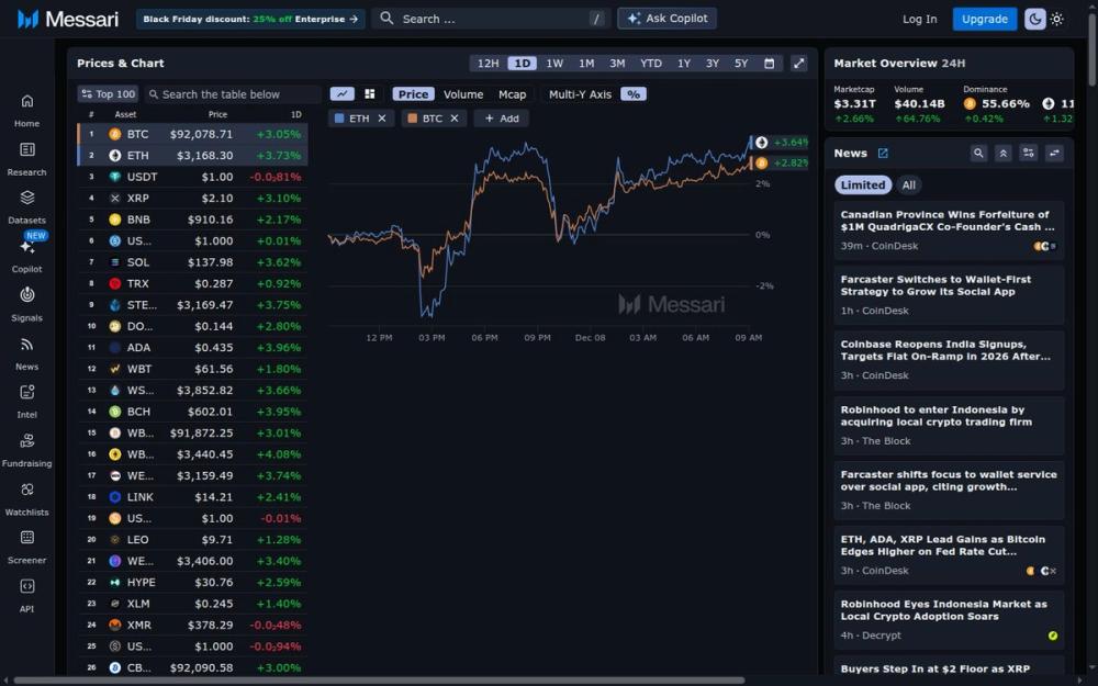 Messari 是一家面向加密货币与区块链生态的综合信息平台,致力于将海量市场数据、深度研究报告与 AI 驱动的分析工具整合在一起。平台覆盖实时价格图表、Top 100 资产榜单、新闻聚合、研究报告、募资与并购数据、代币解锁信息以及企业级情报监控,适用于研究员、投资者、交易员和企业合规团队。