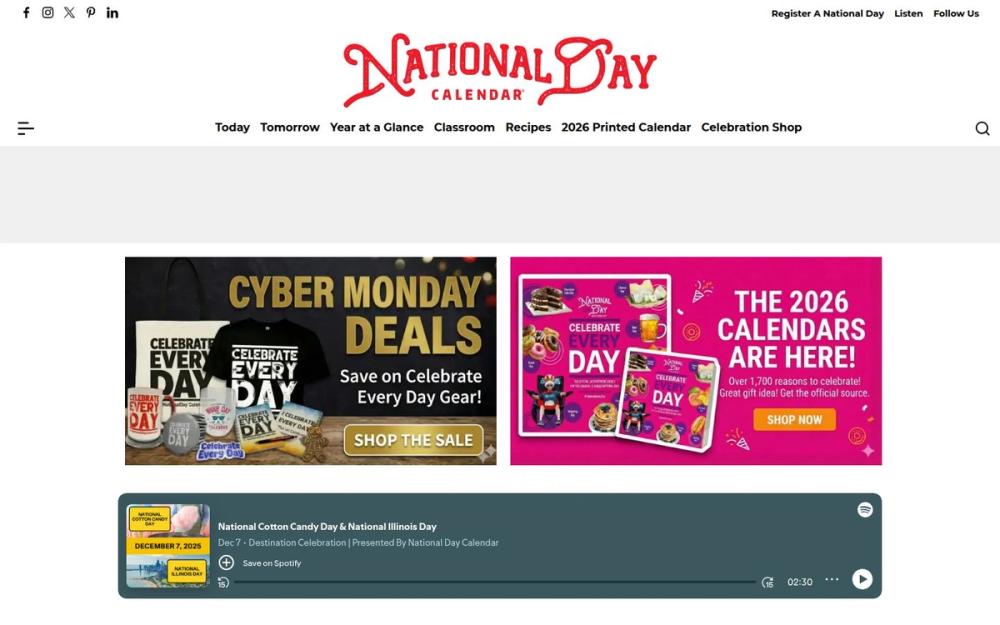 National Day Calendar(国家纪念日日历)是一个以“每日纪念日与庆祝活动”为核心的资源型网站,致力于帮助用户发现并庆祝各种国家日、主题日与地方纪念日。网站页面结构清晰,用户可以查看“今日”“明日”、按月份的“年度概览”,并通过搜索快速定位特定日期或主题。同时站点提供播客、小游戏与商店等延伸内容,增强互动性与实用性。