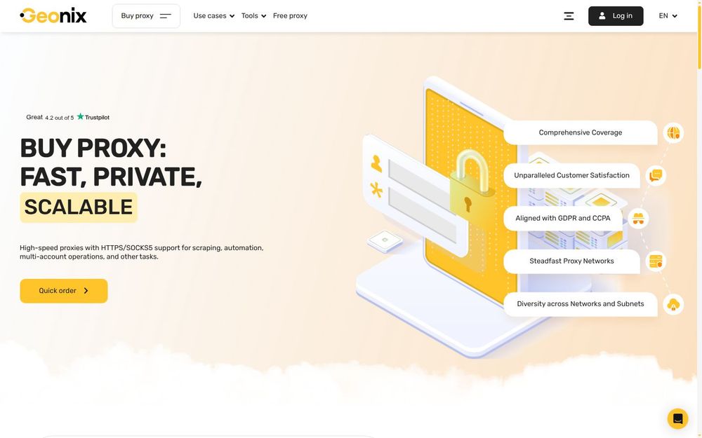 Geonix(原名 Proxy-Sale)致力于为抓取、自动化、社媒运营、电商与SEO等场景提供快速、私密、可扩展的代理服务。平台强调稳定性与合规性,支持 GDPR/CCPA 等隐私规范,提供自动下发与多种授权方式,方便用户快速部署并集成到现有工作流中。