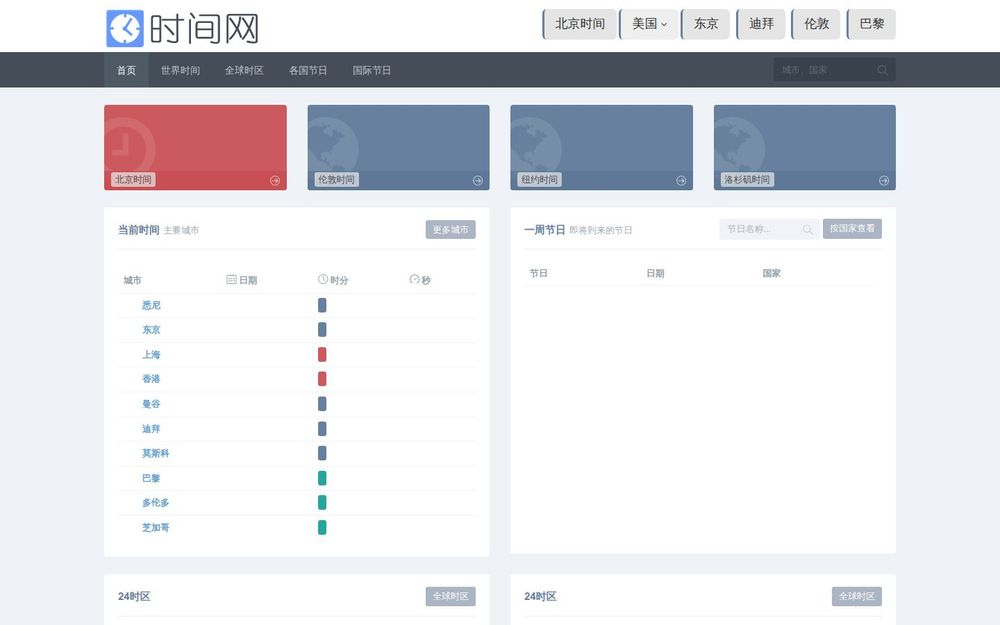 - 城市快速跳转: 每个城市配有图标和独立页面,用户可通过链接快速跳转获取该城市的详细时间信息。