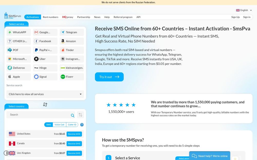 Smspva 是一个面向个人用户和开发者的在线短信接收平台,提供来自全球 60+ 国家与地区的临时与租赁手机号码。平台同时支持虚拟号码与真实 SIM 卡,通过网页面板或 API 完成号码分配与验证码接收,强调快速、稳定与隐私保护。无论是一次性注册、长期维护账号,还是批量化自动化测试,Smspva 都提供了相应的产品和工具。