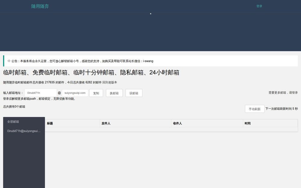 随用随弃是一款专注于临时邮箱与隐私保护的在线服务平台,提供免注册的临时邮箱生成与邮件接收功能。服务覆盖短期(如十分钟)与较长时段(如24小时)临时邮箱,适用于需要临时接收验证码、注册邮件或隐藏真实邮箱地址的场景。页面提供实时邮件统计和切换功能,且支持登录后解锁更多高级特性。
