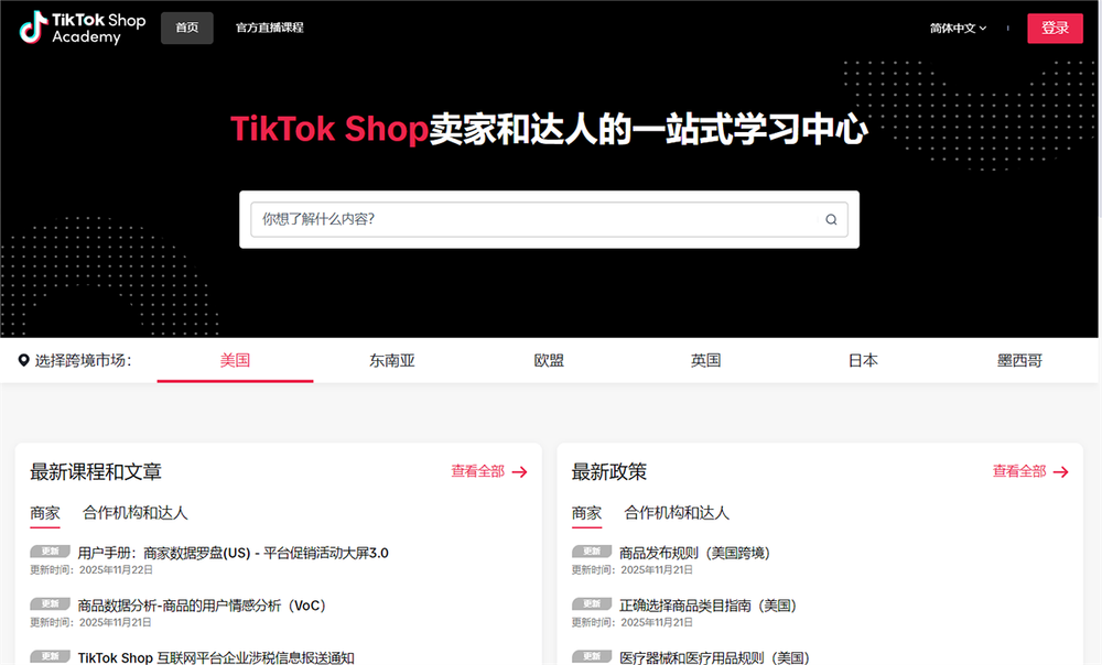 搜索与个性化推荐: 支持关键词搜索课程。 根据店铺地区(如美国 shop_region=us)和身份(role=seller)自动推荐相关内容。