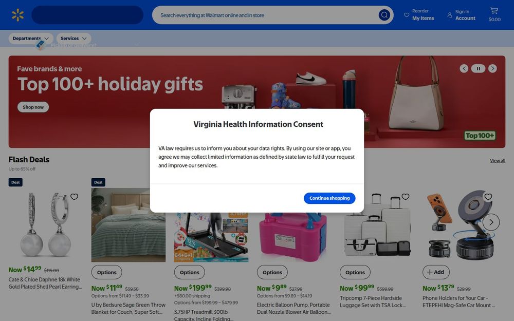 Walmart 的页面信息清晰,商品展示结合原价与折后价,对应运费与配送选项一目了然。网站通过图片、价格历史与“更多选项”引导用户比较与挑选,同时标注会员专享或限时优惠,帮助用户快速做出购买决定。药房信息和州法律提示(如弗吉尼亚州健康信息同意)也体现了法规合规与用户告知责任。
