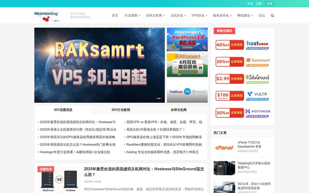 WHT中文站(WebHostingtalk 中文站)是面向中文受众的主机与服务器资讯聚合平台,致力于为用户提供VPS、美国/香港服务器的选购指南、测评对比和优惠信息。站点以实用性为导向,整合厂商促销、产品对比与配置解析,帮助用户在复杂的主机市场中做出明智选择。站内既有短平快的优惠推荐,也有深入的产品对比与使用心得,适合开发者、站长、小型企业以及对海外主机有需求的个人用户。