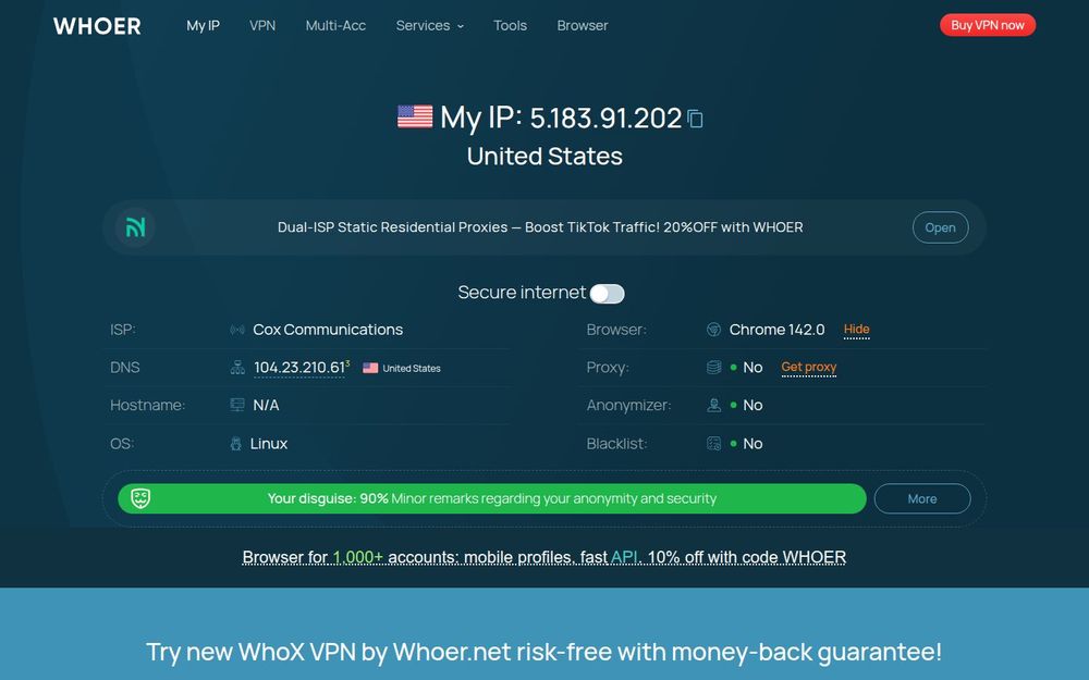 Whoer 适用于技术支持工程师、注重隐私的普通用户、多账号运营者与安全研究者。优点在于即时、详细、覆盖面广且配有实用修复建议;同时页面还集成了付费的 WhoX VPN 与第三方代理广告,用户需注意商业推广与测试结果独立性。Whoer 的检测依赖于浏览器和网络提供的信号,极少数情况下可能因为本地插件或 CDN 缓存导致检测差异。