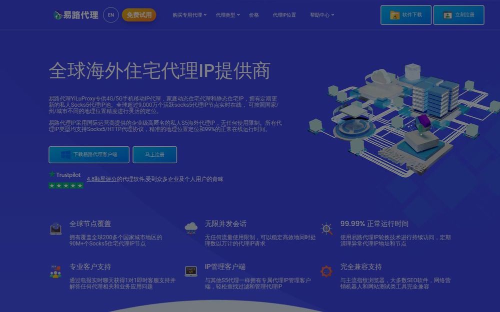 易路代理(YiLu Proxy)是一家专注于海外代理IP服务的提供商,面向个人与企业客户提供高匿名性的住宅代理、数据中心代理和移动4G/5G代理。平台强调全球覆盖、海量IP池与高可用性,适用于社交媒体运营、网络爬虫、广告验证、流媒体解锁与跨境电商等多种业务场景。易路代理支持SOCKS5与HTTP协议,并配套专属客户端与API接口,方便快速集成与管理。
